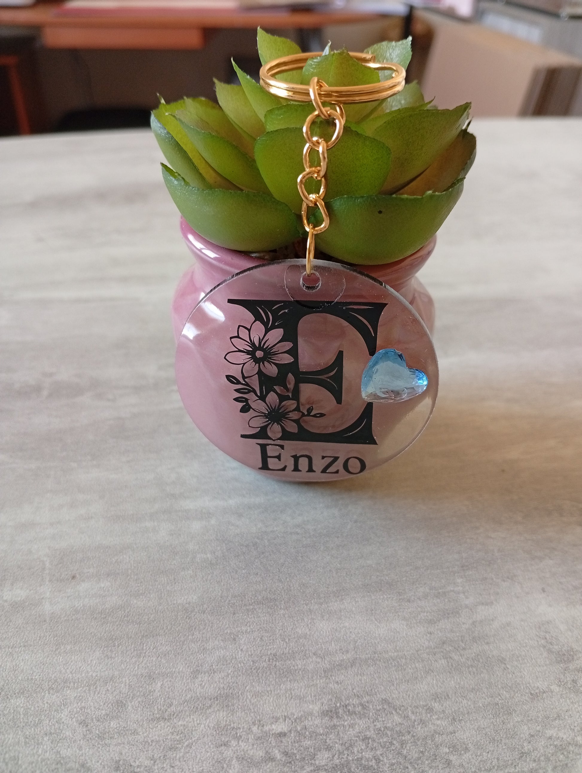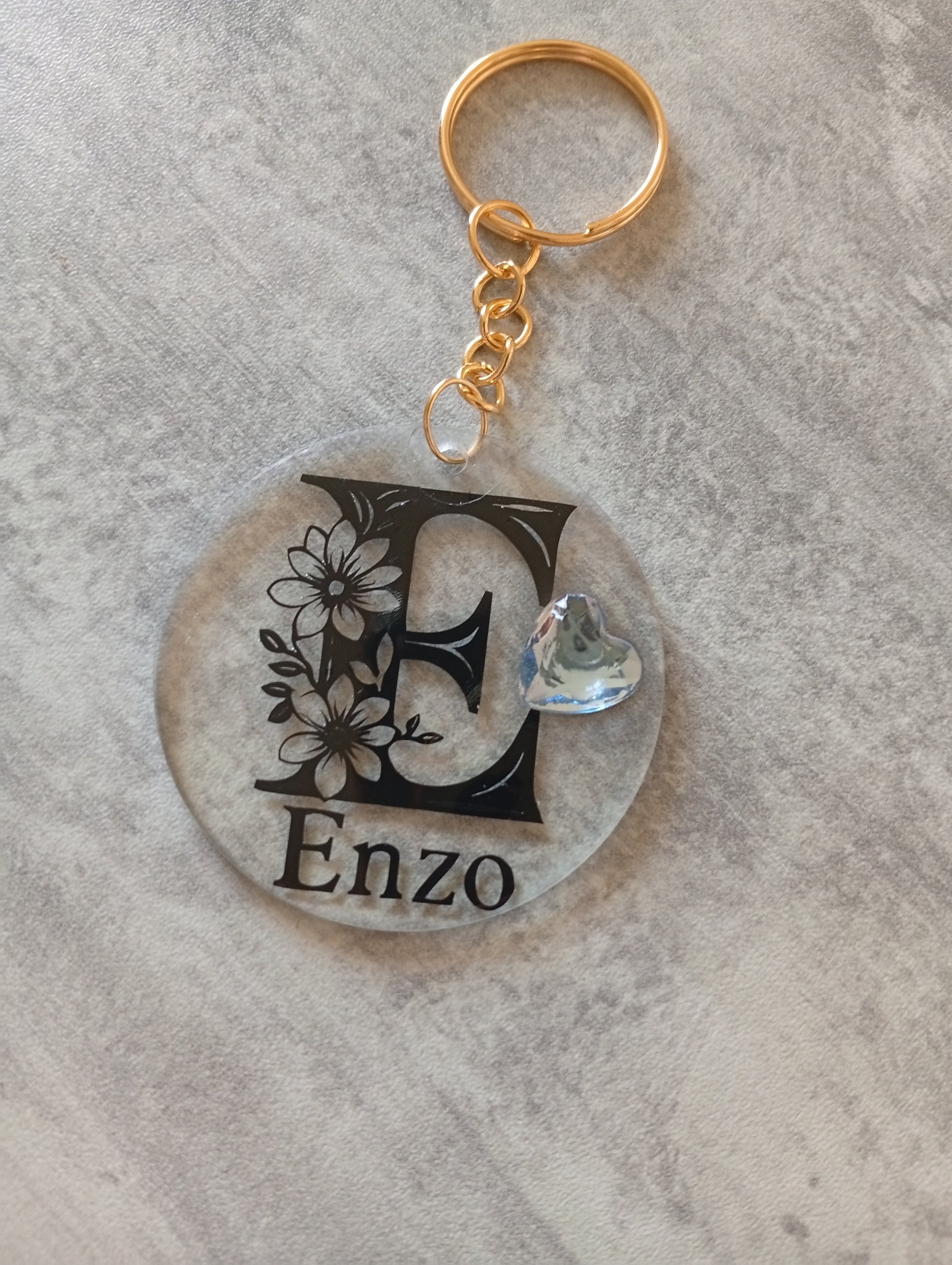 Ce porte-clĂ©s dĂ©licat cĂ©lĂšbre le prĂ©nom “Enzo” avec douceur et Ă©lĂ©gance. Sur son disque en acrylique transparent, une lettre “E” fleurie s’épanouit comme une initiale enchantĂ©e. Un cƓur translucide vient y murmurer une touche d’amour, tandis que la finition en rĂ©sine UV protĂšge chaque dĂ©tail comme un Ă©crin de lumiĂšre.