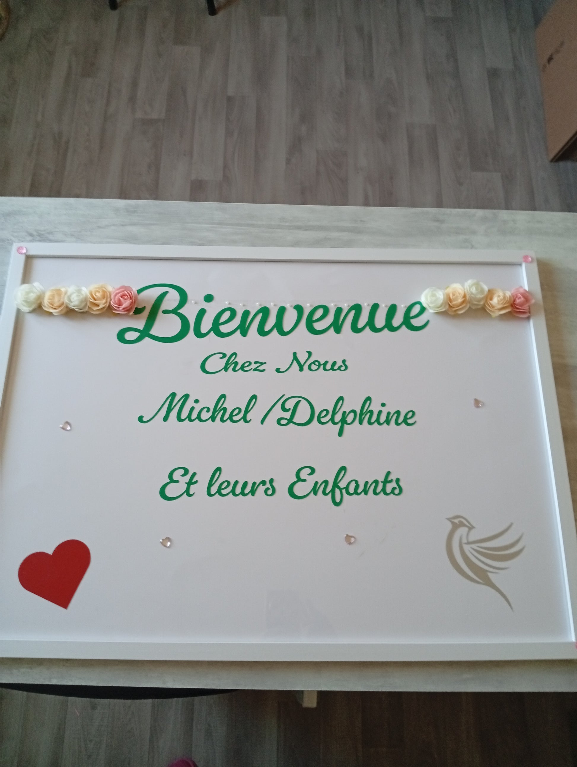 đž Bienvenue chez nous â un message simple, sincĂšre, entourĂ© de fleurs dĂ©licates, de cĆurs en relief, et dâun petit oiseau stylisĂ© qui veille sur les prĂ©noms. Chaque Ă©lĂ©ment est soigneusement dĂ©coupĂ©, assemblĂ© et posĂ© avec amour, pour crĂ©er une piĂšce unique et pleine de sens.