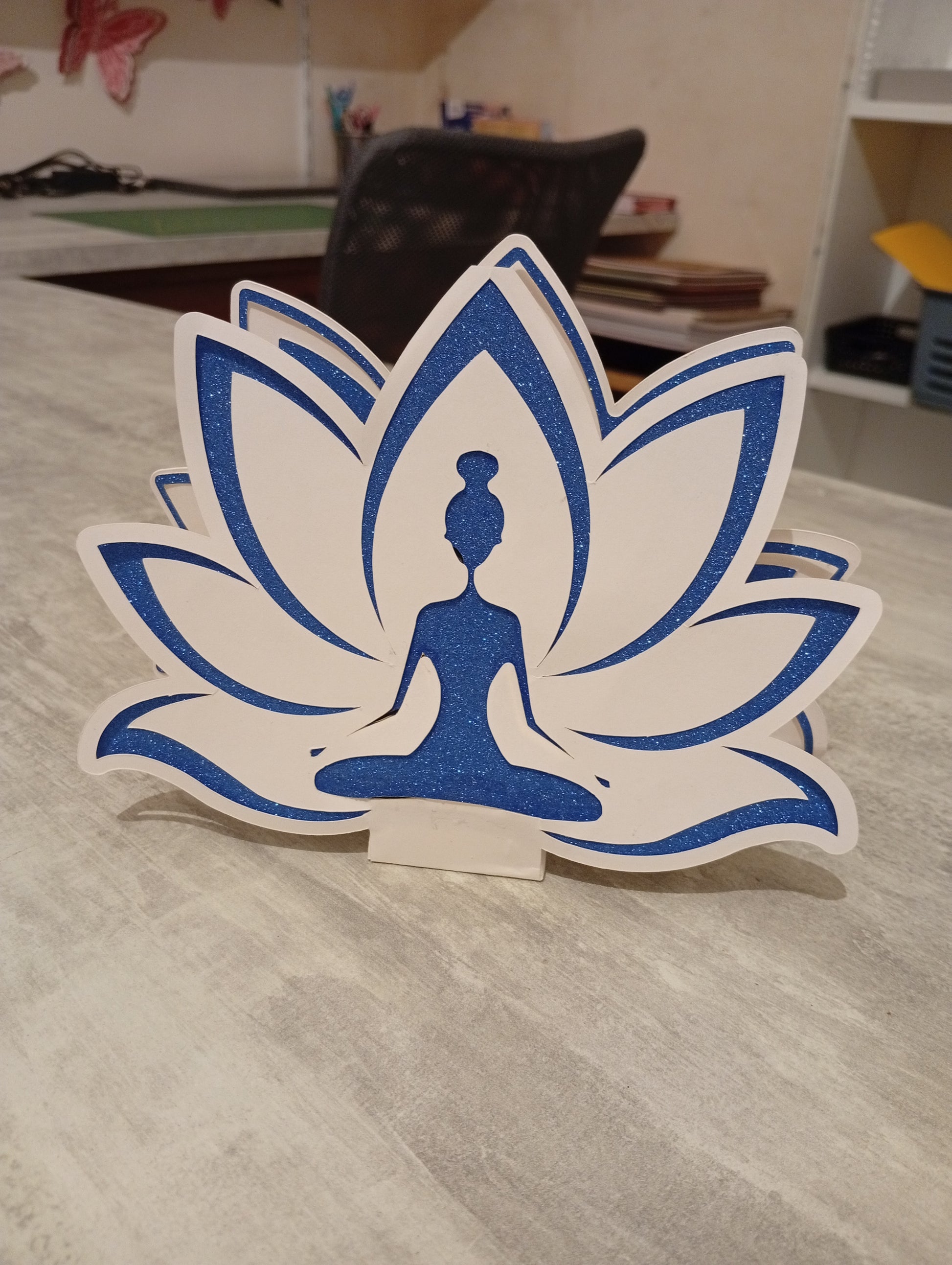 Plongez dans un univers de calme et de lumière avec cette fleur de lotus artisanale, découpée avec soin dans du papier cartonné épais et sublimée par des paillettes bleues. En son cœur, une silhouette méditative invite à la détente, doucement éclairée par une bougie LED sécurisée, nichée dans son socle discret.
