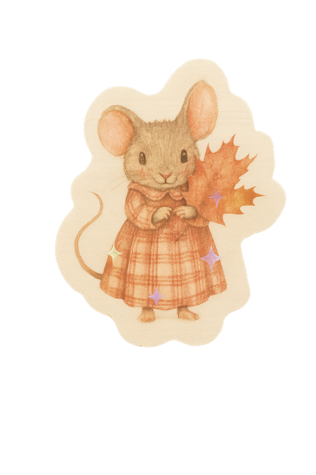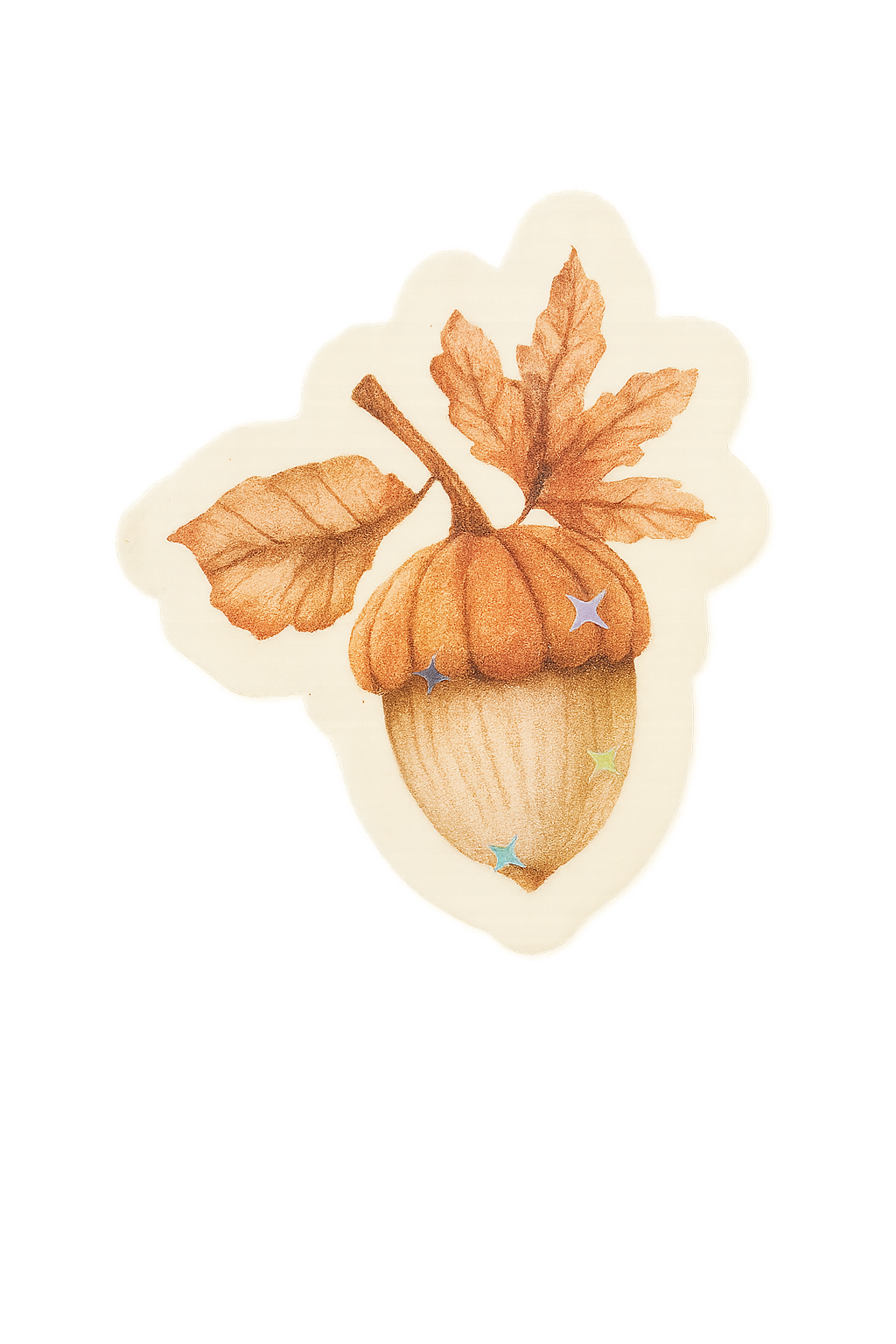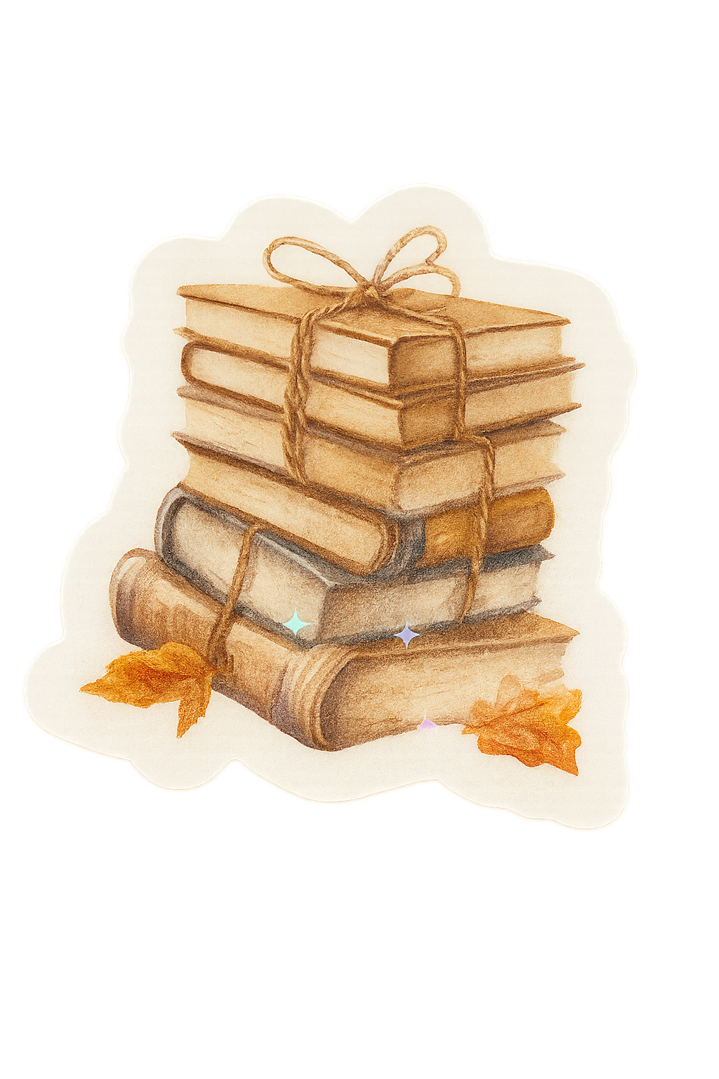 Un sticker artisanal représentant une pile de livres anciens, liés par une ficelle et entourés de feuilles d’automne. Chaque détail est pensé pour évoquer la douceur des saisons et le charme des pages tournées. La finition holographique ajoute une touche de lumière et de magie, comme une étoile posée sur le papier.